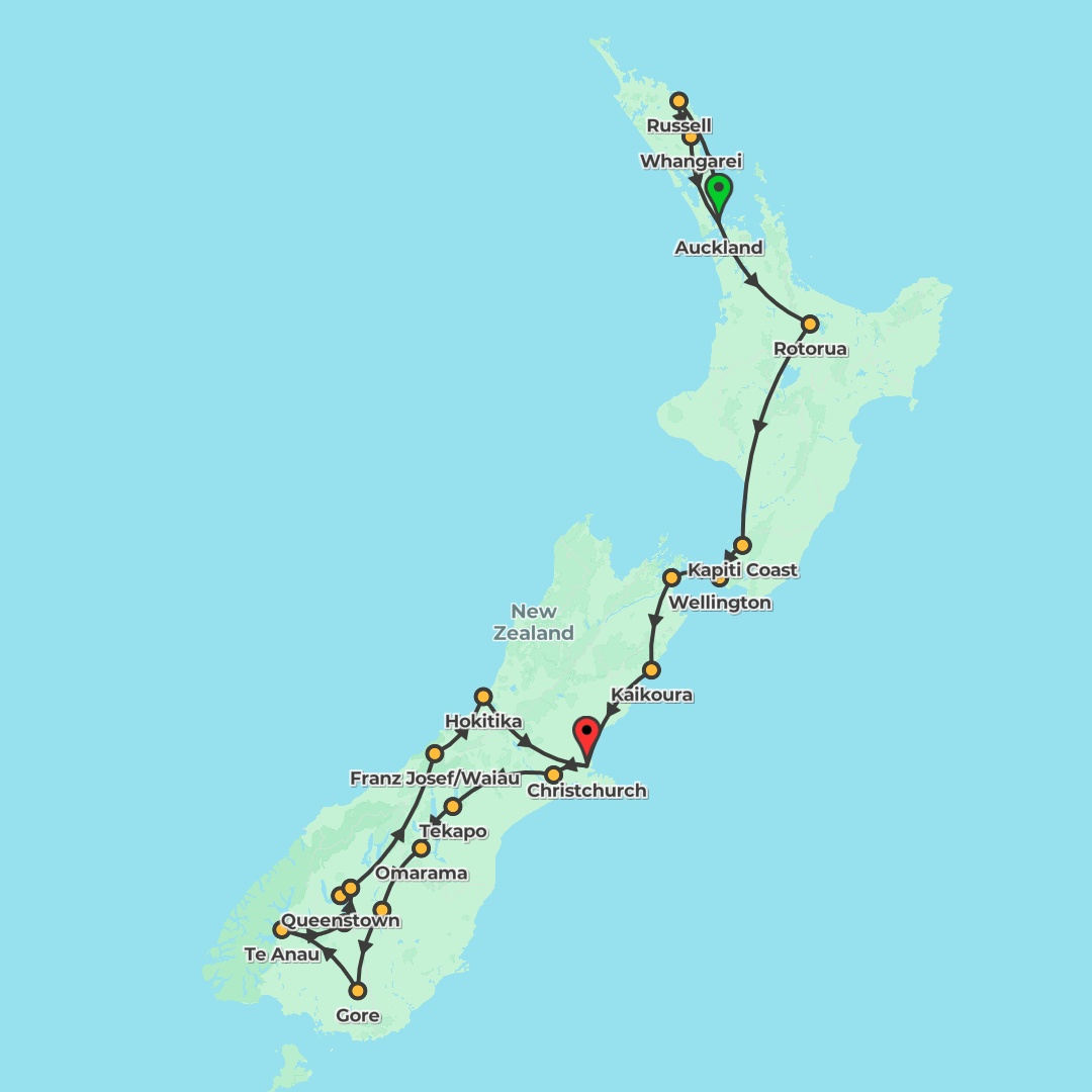 Discover New Zealand on a southbound adventure from Auckland to Christchurch, blending cultural highlights, wildlife encounters and free-time thrills across cities, lakes, volcanoes and coastlines.