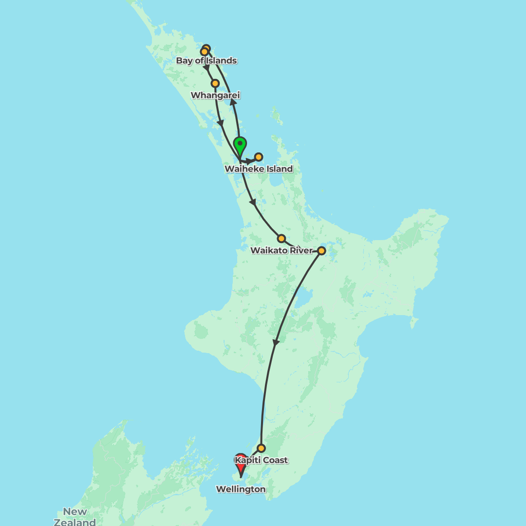 Explore New Zealand’s North Island from Auckland to Wellington, featuring the Bay of Islands and Rotorua with cultural highlights, glowworm caves, Huka Falls and guided city sightseeing.