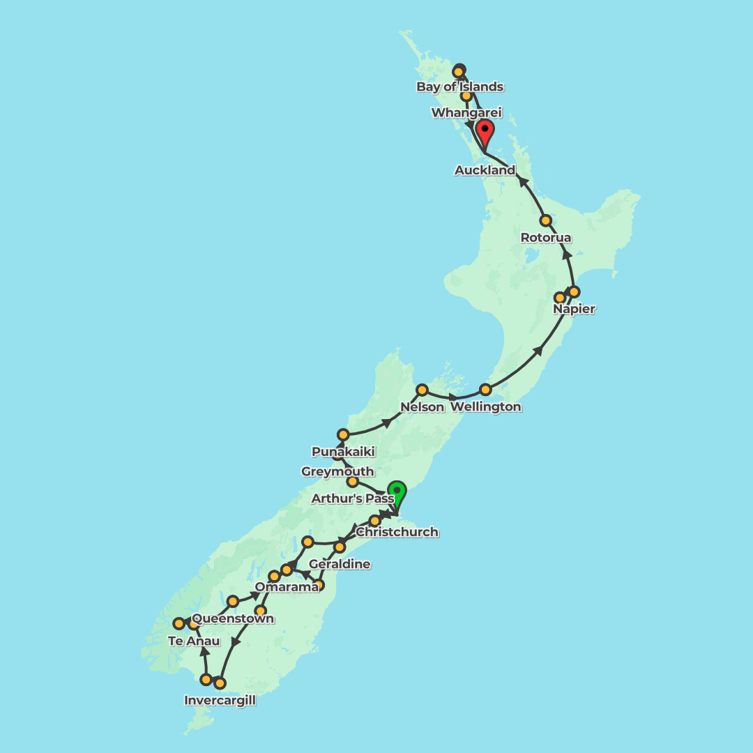 Discover New Zealand on a southbound adventure from Auckland to Christchurch, blending cultural highlights, wildlife encounters and free-time thrills across cities, lakes, volcanoes and coastlines.