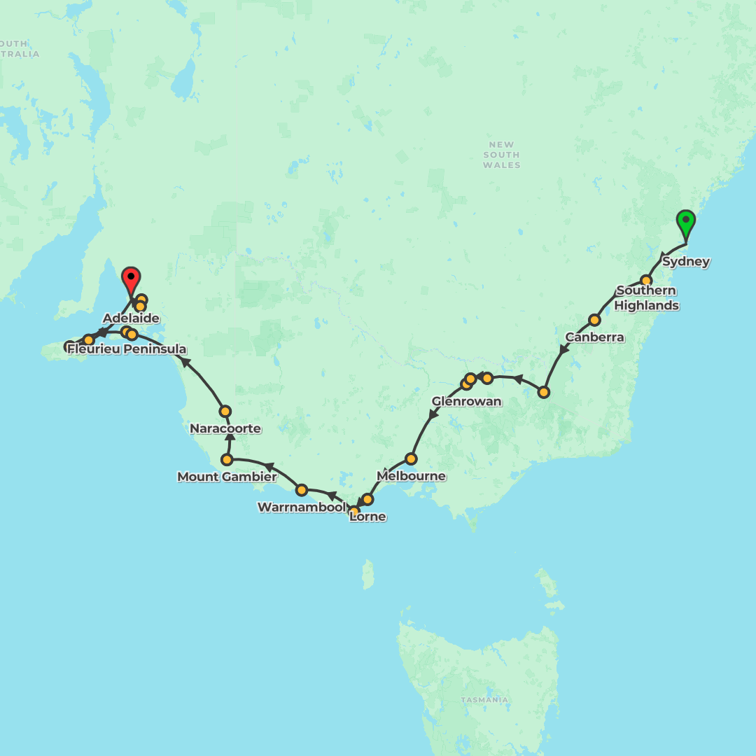 Journey from Sydney to Adelaide via Melbourne, the Great Ocean Road and Kangaroo Island, with wine tasting in Coonawarra, World Heritage Budj Bim, and cultural experiences at the Koorie Heritage Trust