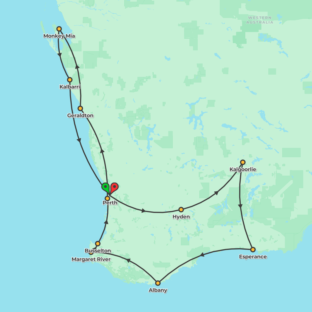 Explore Western Australia from Broome to Perth on a 13-day escorted journey featuring Karijini National Park, the Ningaloo Coast, Monkey Mia, Kalbarri, and the Pinnacles.