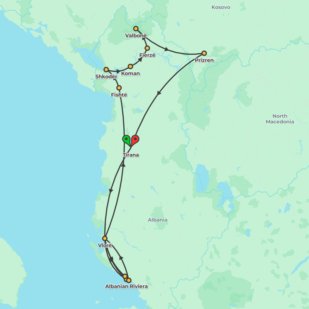 Explore Albania’s beaches and peaks on an 8-day summer journey from Tirana, blending the Riviera, Lake Komani and Valbonë with a taste of Kosovo, guided moments and time to explore.