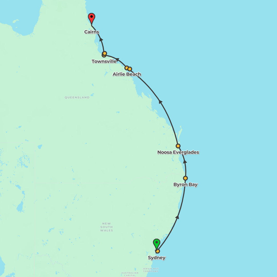 Journey from Sydney to Cairns along Australia’s East Coast, combining surf-friendly shores, eco lodge nights in the Noosa Everglades, island time in the Whitsundays and Magnetic Island, and rainforest