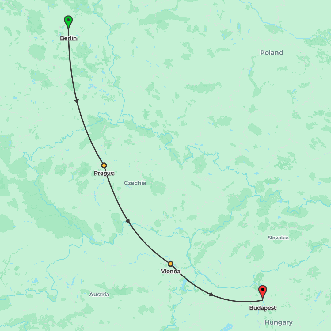 Discover Berlin, Warsaw, Kraków, Budapest, Vienna and Prague on a 15-day journey across Germany, Poland, Hungary, Austria and the Czech Republic, with included city tours, scheduled stops en route, an