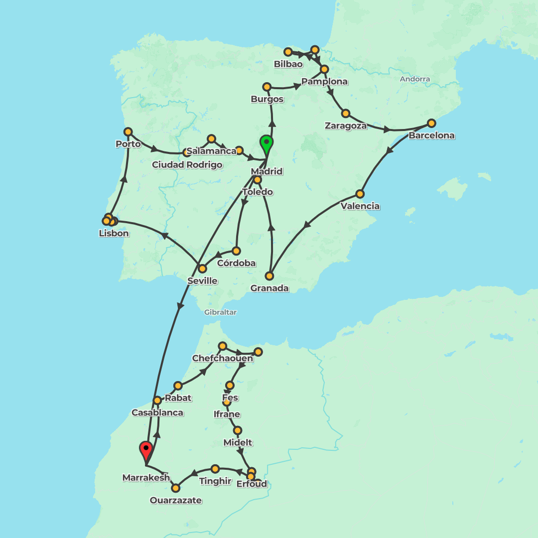 From Madrid to Marrakesh, discover Spain, Portugal and Morocco on a month‑long adventure with local guides, iconic cities and a memorable night in a Merzouga desert camp.