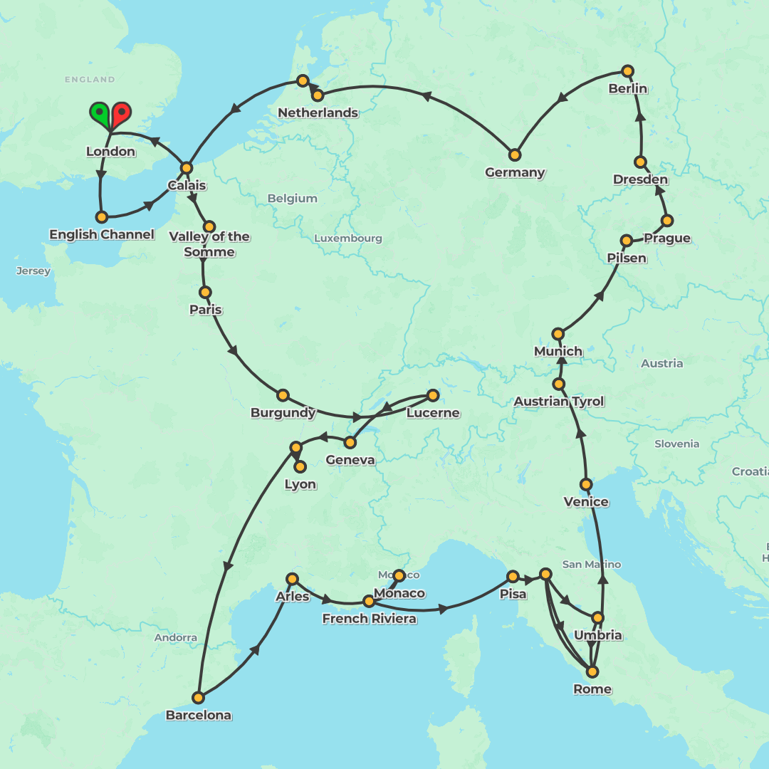 Trace Europe from London to Amsterdam on this Classic Group tour with Eurostar to Paris, guided highlights across France, Spain, Monaco, Italy, Slovenia, Austria, Switzerland and Germany, plus boat tr