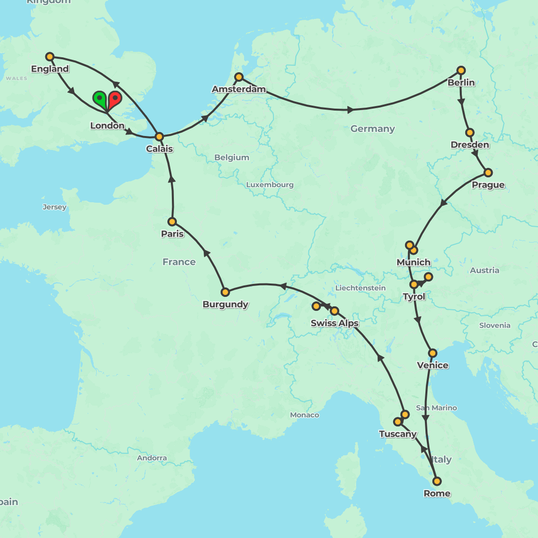 Discover Europe on a 14-day journey from London to Amsterdam, taking in Paris, the Swiss lakes, Italy’s icons, Austria and the Rhineland with guided sightseeing, comfortable hotels and coach travel.
