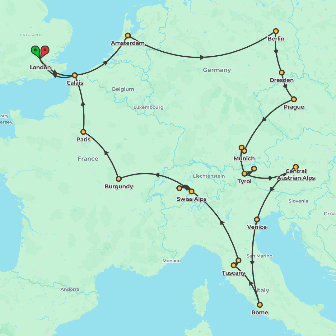 Starting and ending in London, this European Trail links Amsterdam, Berlin, Prague, Vienna, Krakow, Budapest, Lake Bled, Venice, Rome, Florence, the Swiss Alps and Paris, with included breakfasts and