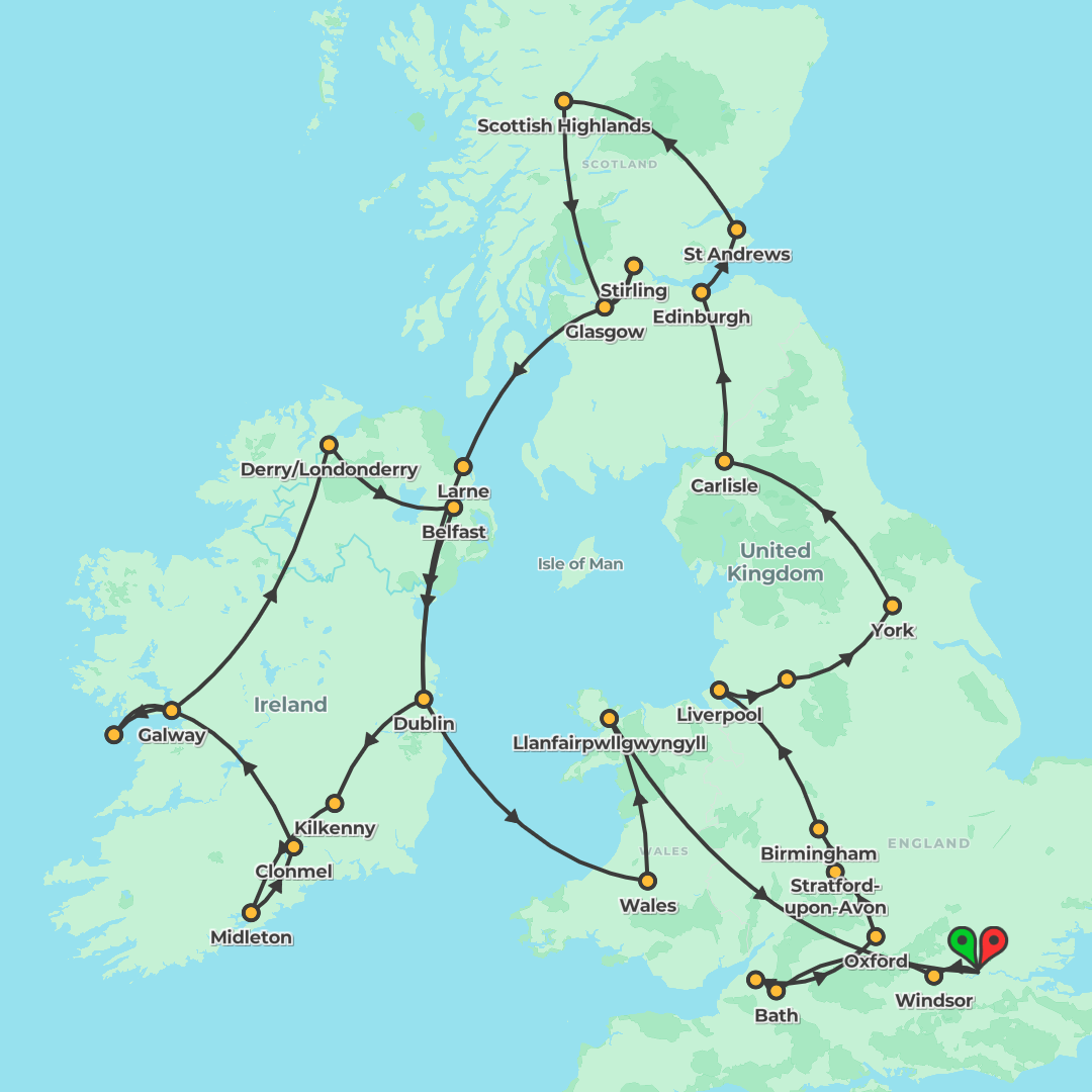 An 18‑day summer journey from London through England, Scotland, Wales and Ireland, combining iconic cities and wild landscapes with hotel stays, coach travel and a ferry crossing.