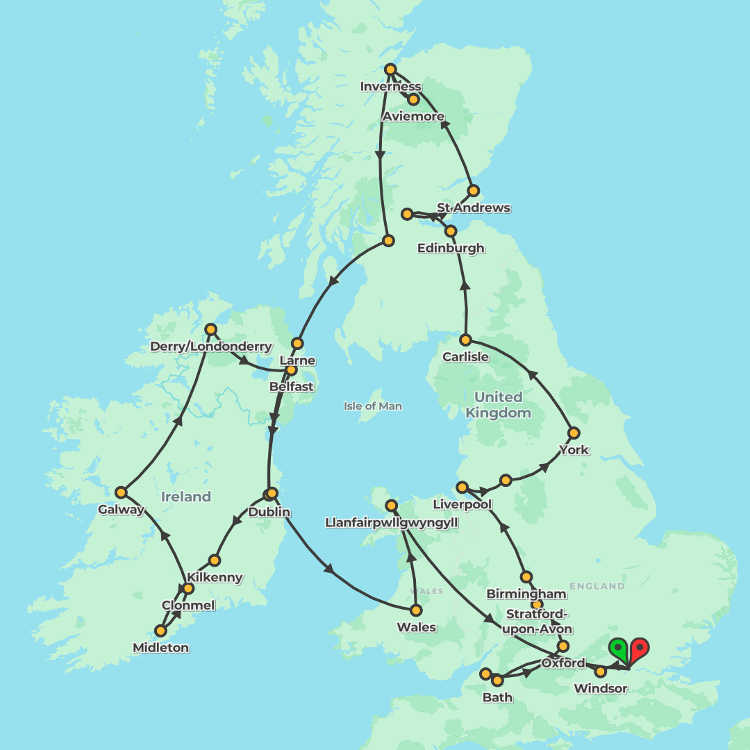Discover the best of Britain and Ireland on a 15-day itinerary linking London, Edinburgh, Dublin and Cardiff with scenic drives, ferry crossings and daily breakfasts plus select dinners.