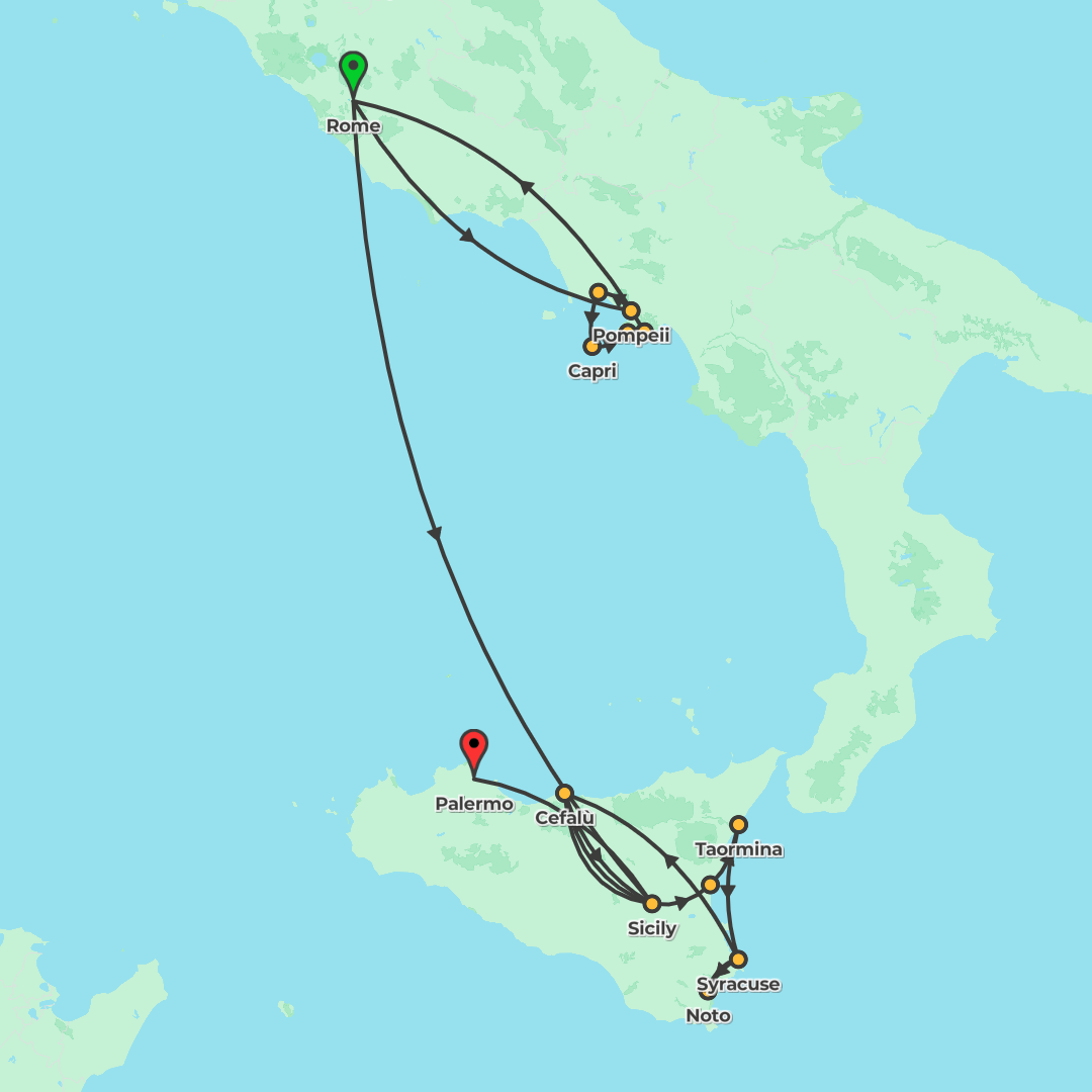 Discover Italy from Rome to Palermo on a 13-day journey featuring the Amalfi Coast and Capri, an internal flight to Sicily, and time in Taormina, Syracuse, Cefalù and the Valley of the Temples.