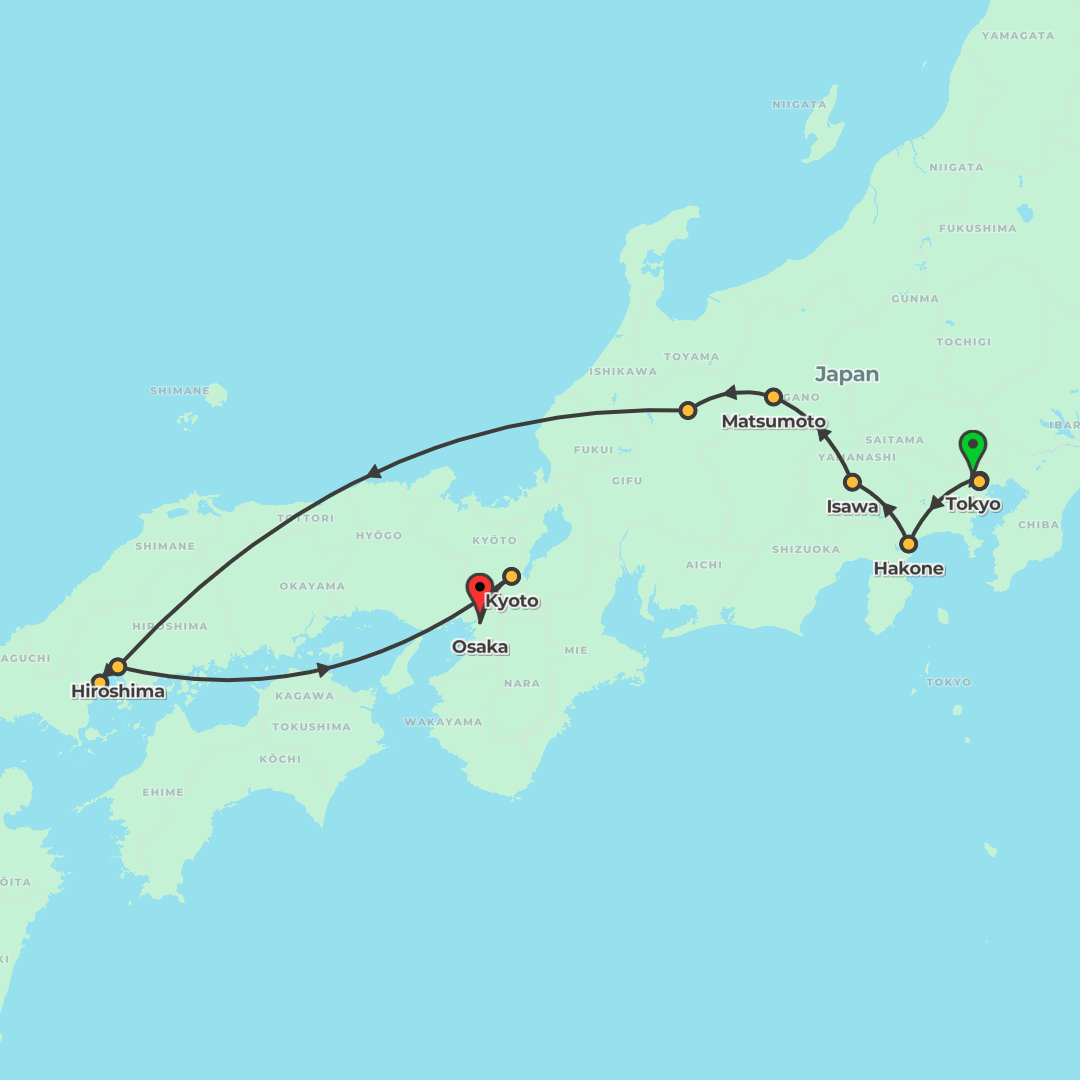 Journey from Tokyo to Osaka, taking in Mt. Fuji, Takayama, Kanazawa, Kyoto, Awaji Island, Miyajima and Hiroshima, with cultural experiences and a night in a traditional ryokan.