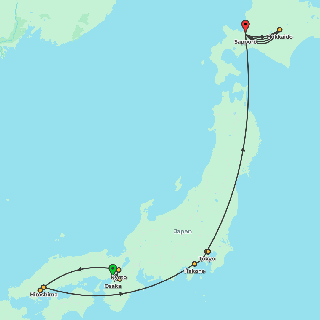 Journey from Osaka to Sapporo via Kyoto, Hiroshima, Hakone and Tokyo, then enjoy flexible unescorted ski days in Hokkaido.
