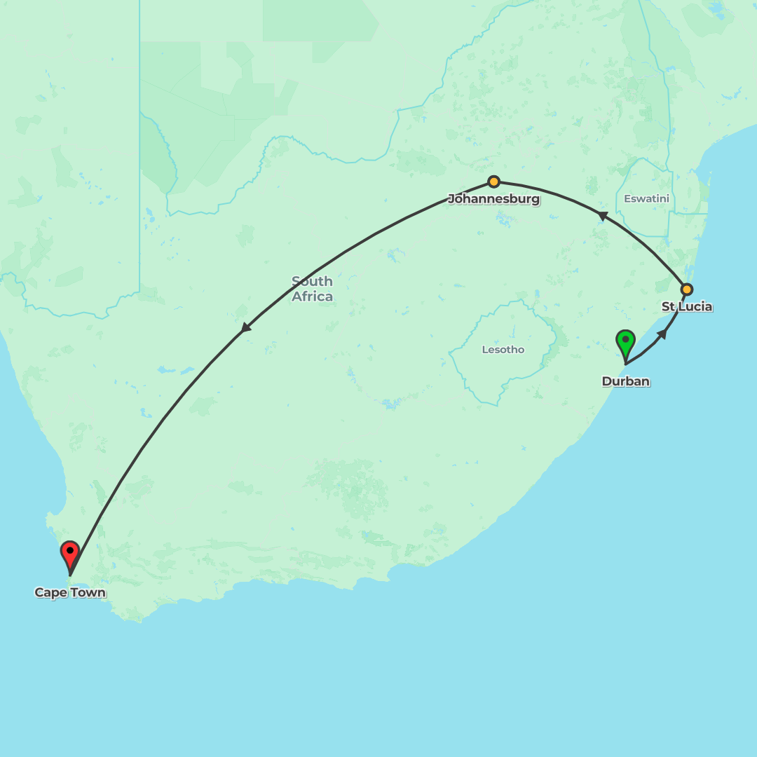 From coastal Durban to Kruger via St Lucia and Eswatini, discover wildlife-rich landscapes, distinctive stays and optional game drives on a memorable journey.
