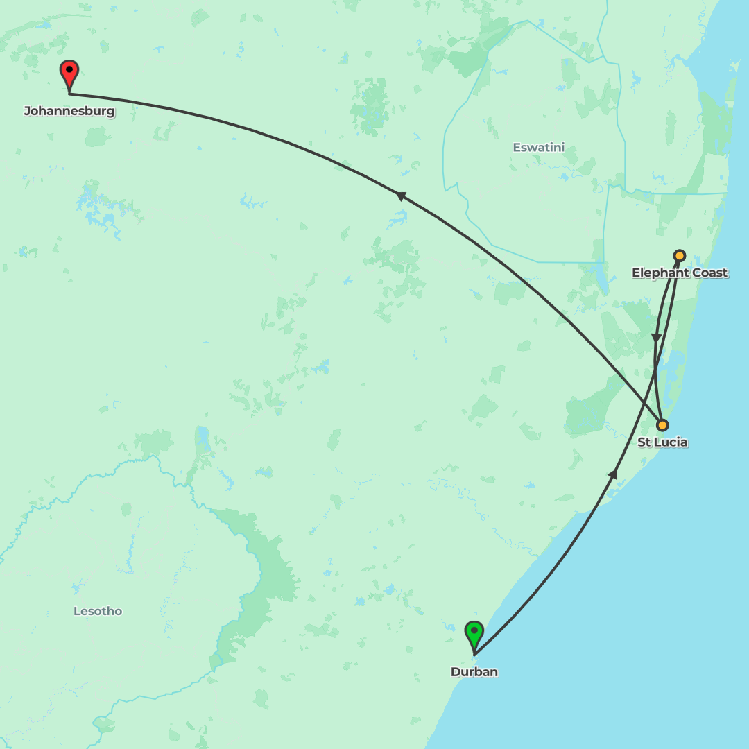 From Durban to Johannesburg, explore St Lucia’s wetlands, venture via Hluhluwe‑iMfolozi, cross into Eswatini’s Mlilwane Sanctuary, and enjoy an exclusive camp stay inside Kruger on a wildlife‑packed j