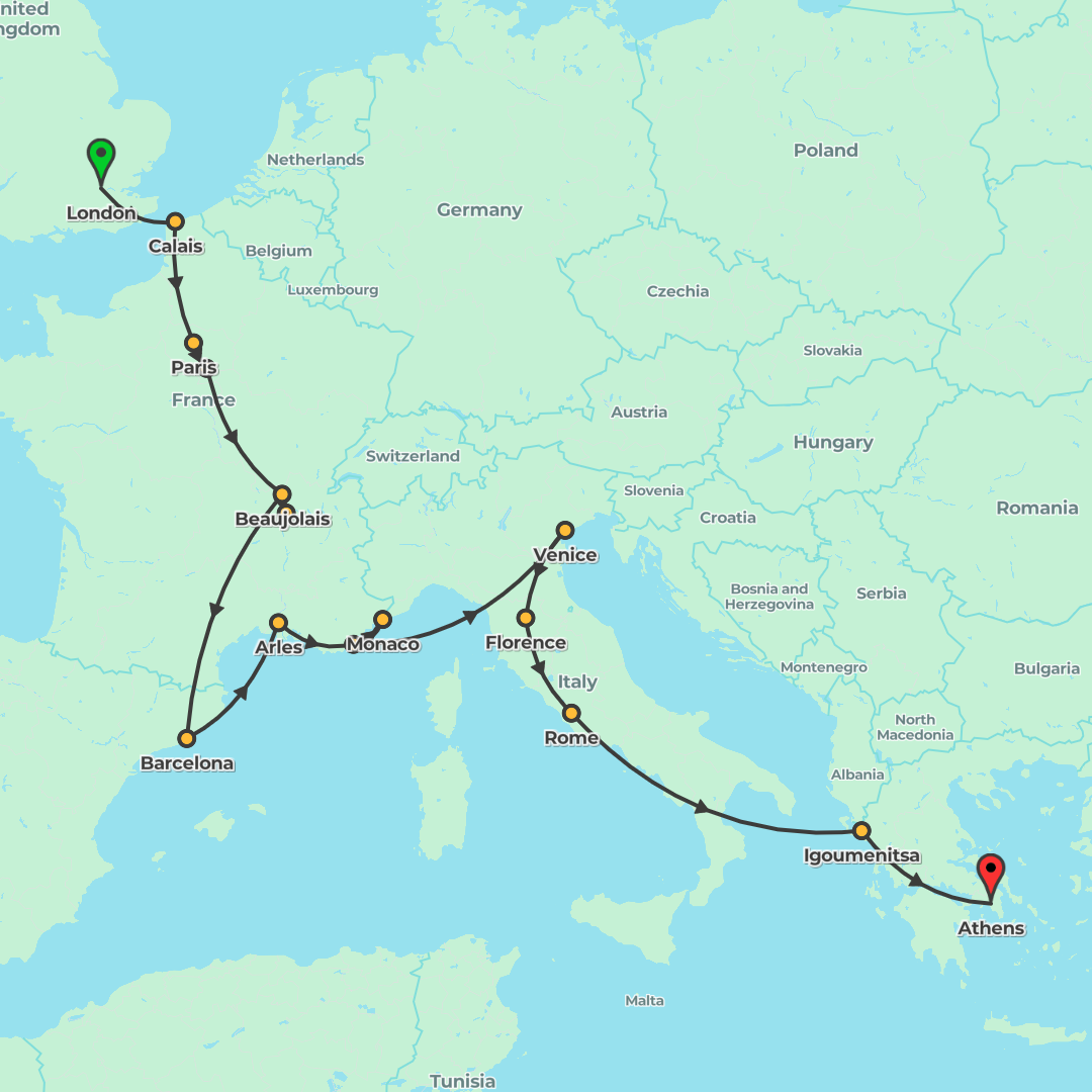 Embark on an unforgettable journey from London to Athens, exploring iconic European cities and breathtaking landscapes along the way.