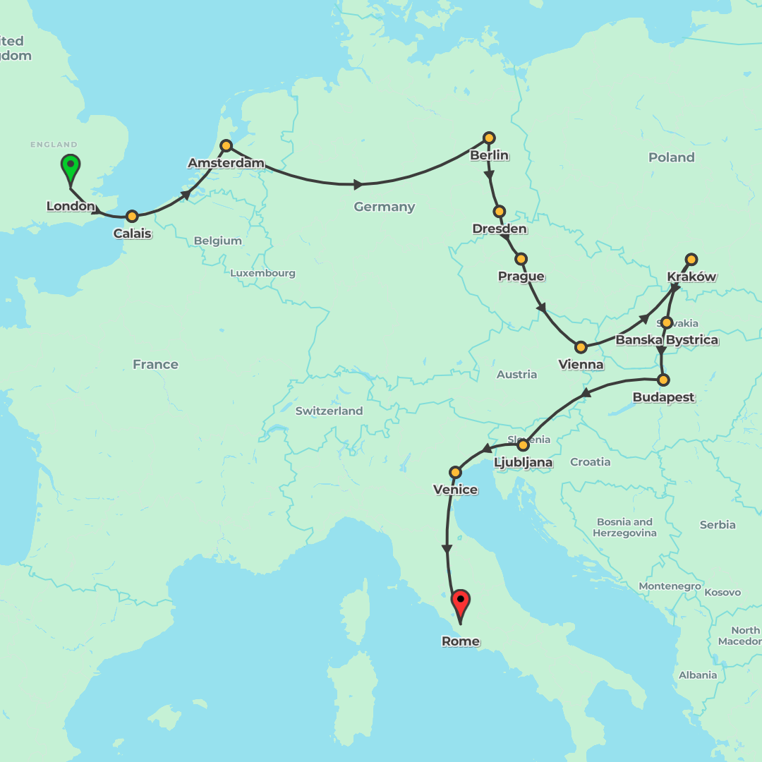 Journey from London to Rome via Amsterdam and Europe’s great capitals on a summer adventure of iconic cities, shared stays and memorable experiences.