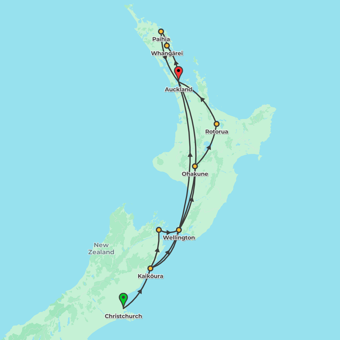 Journey northbound from Christchurch to Auckland over 12 days, visiting Kaikōura, Wellington, Mount Ruapehu, Lake Taupō, Rotorua and the Bay of Islands, with wildlife encounters, Māori culture and sce