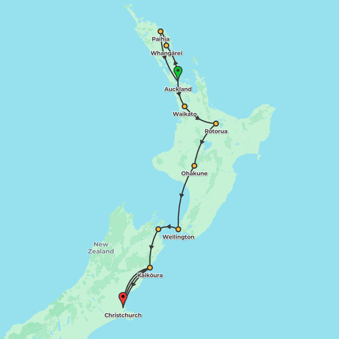 A 21-day southbound adventure from Auckland to Christchurch, blending lively cities, dramatic coastlines and alpine scenery with memorable cultural experiences and cruises.