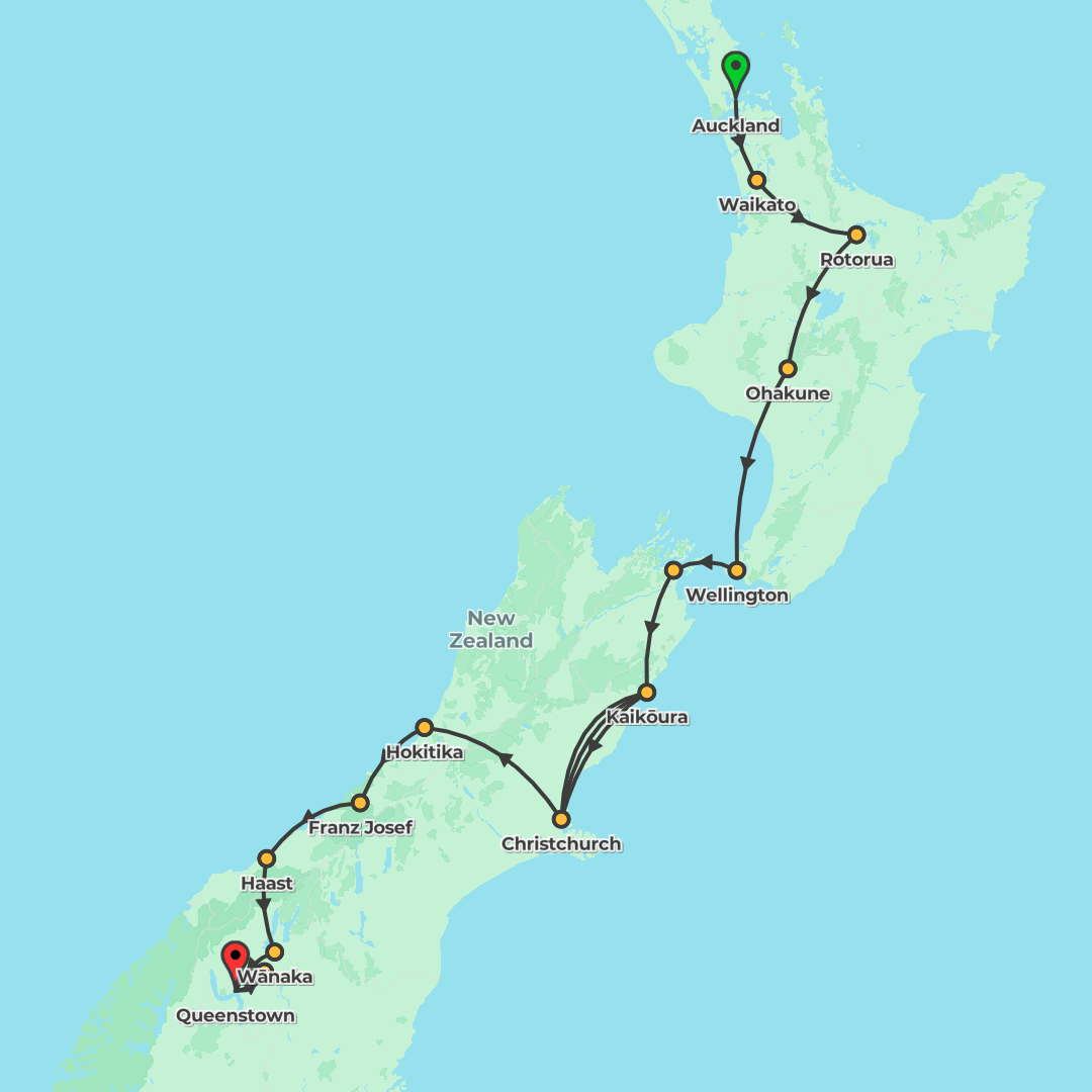 Journey northbound from Christchurch to Auckland over 12 days, visiting Kaikōura, Wellington, Mount Ruapehu, Lake Taupō, Rotorua and the Bay of Islands, with wildlife encounters, Māori culture and sce