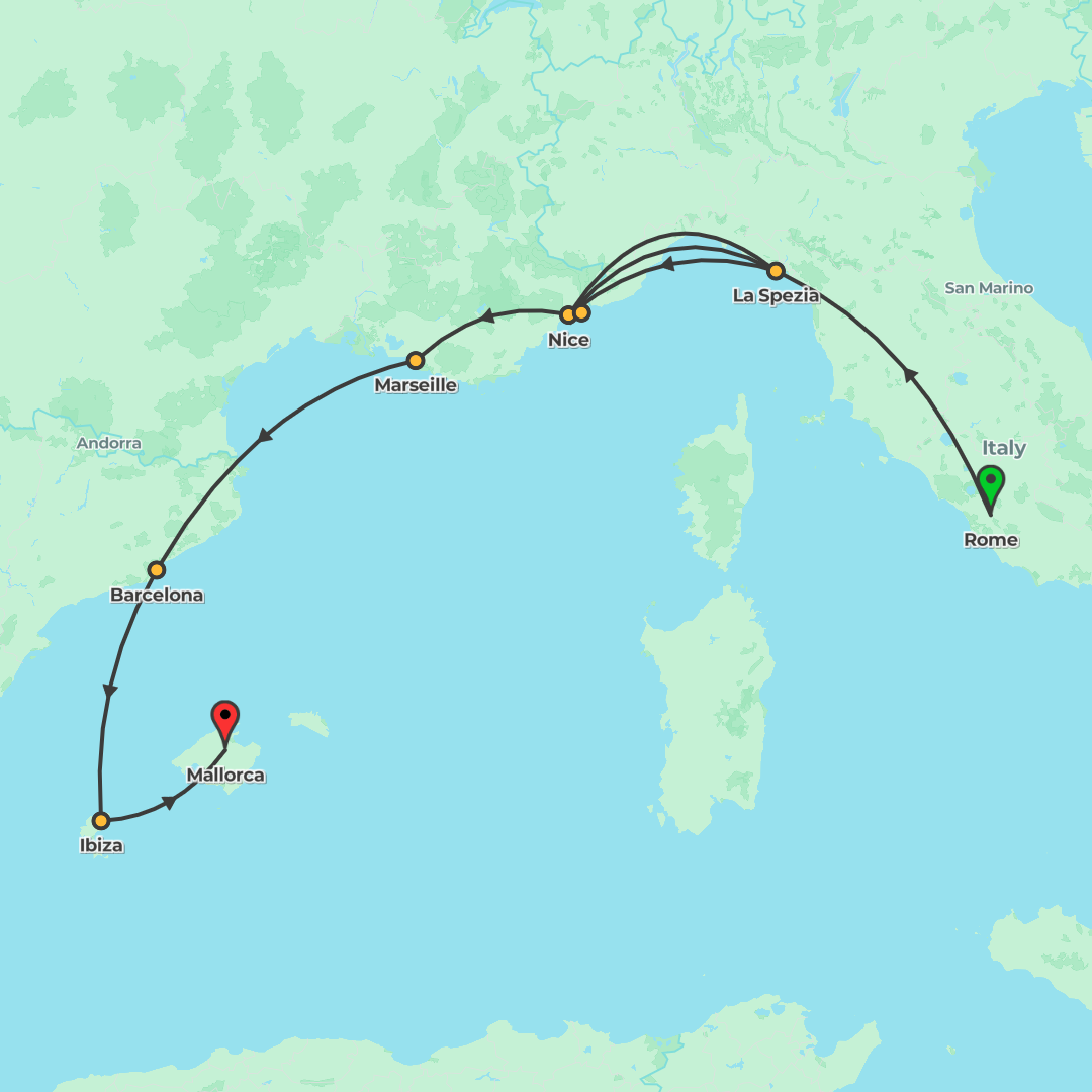 A train adventure for 27–35s from Rome to Barcelona via the Italian and French Rivieras, Cinque Terre and Monaco, mixing headline sights with plenty of free time and a few included experiences.
