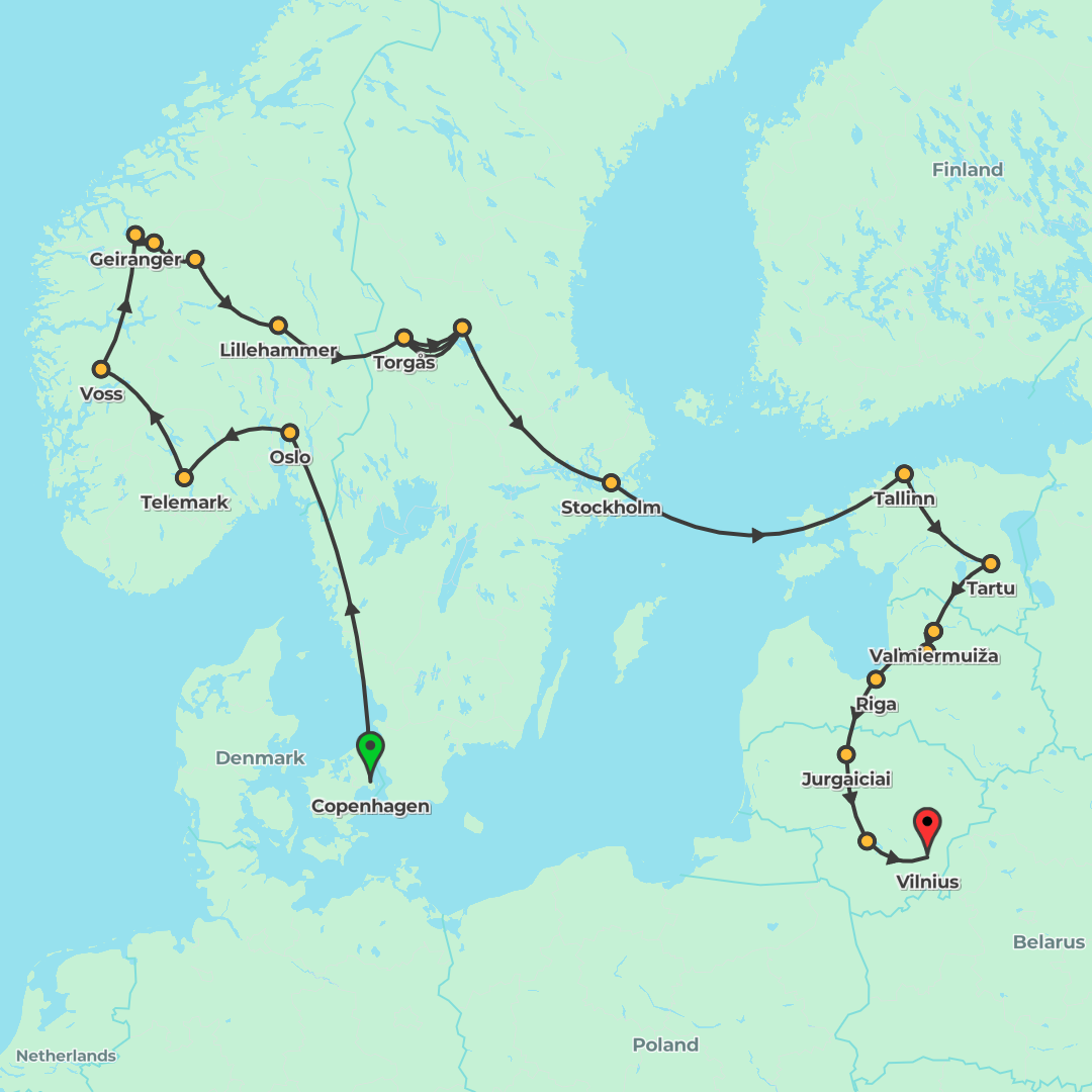 Discover Scandinavia and the Baltics on a 32-day journey from Copenhagen to Vilnius, blending vibrant cities, fjord and island adventures, and immersive local experiences.