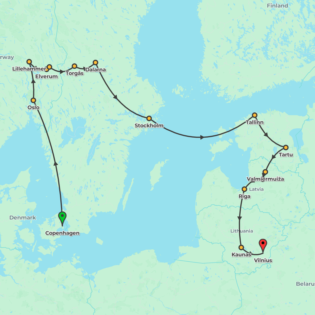 Discover Scandinavia and the Baltics on a 32-day journey from Copenhagen to Vilnius, blending vibrant cities, fjord and island adventures, and immersive local experiences.