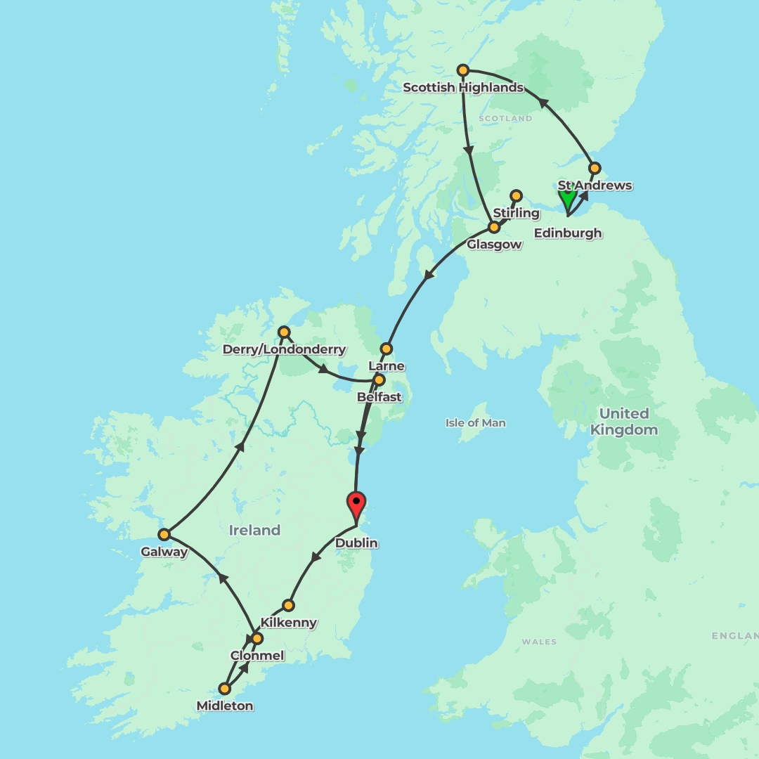 Discover Ireland, Northern Ireland and Scotland from Dublin to Edinburgh, featuring Belfast’s Titanic history, scenic highland drives, castles, a distillery visit and a ferry crossing.