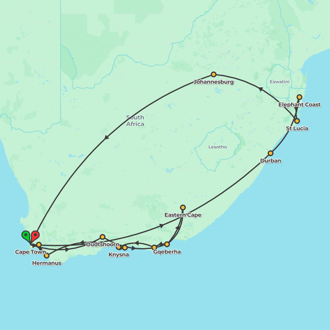 A premium adventure through South Africa’s Garden Route from Cape Town to a private game reserve, blending city highlights, Winelands tastings, caves, coast and wildlife.