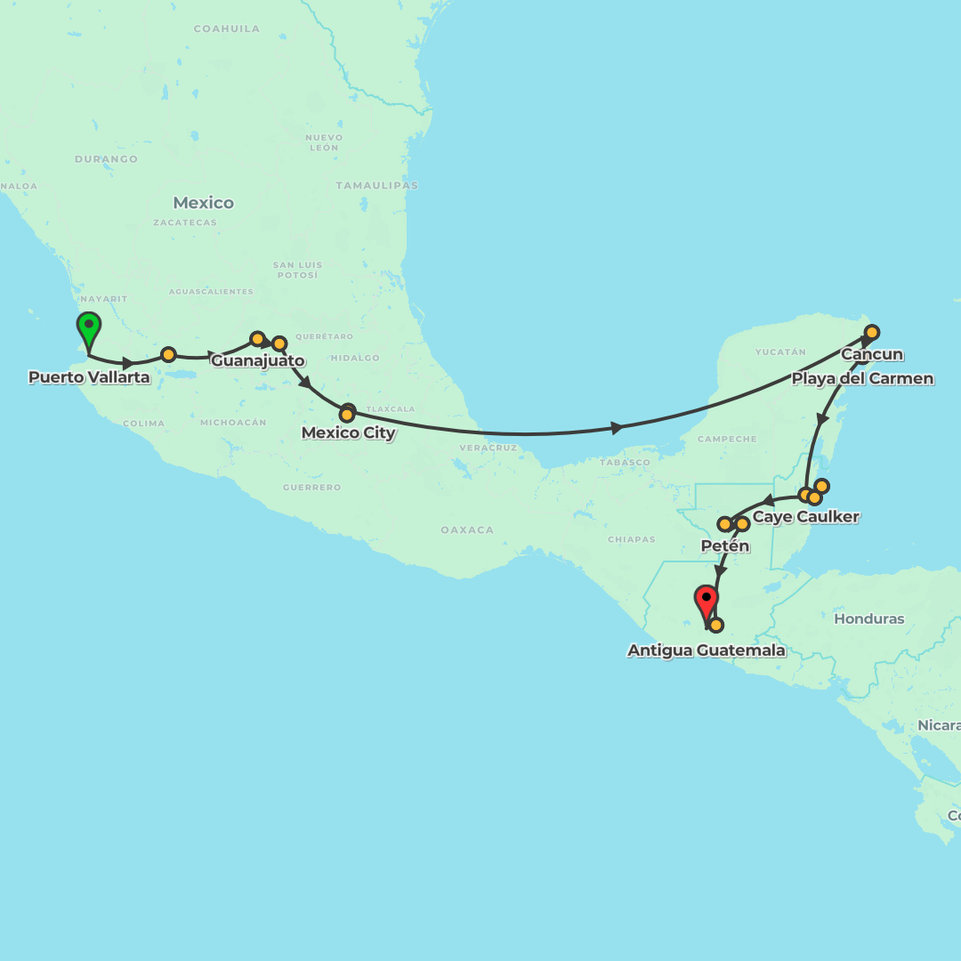 An 18-day adventure from Puerto Vallarta to Antigua, combining Mexico’s cities and beaches with Caye Caulker’s island bliss and Guatemala’s Mayan wonders, featuring guided visits and ample free time.