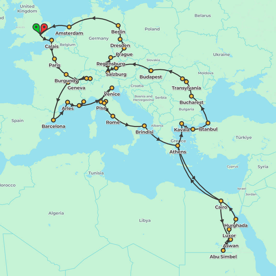 A 45-day adventure from London exploring iconic cities and landscapes across Europe and Türkiye, with flights to Egypt for Cairo, Aswan, Luxor and the Red Sea, plus ferries, an overnight train and spe