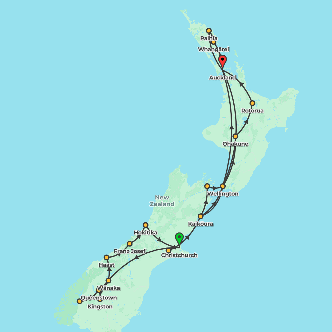 Journey northbound from Christchurch to Auckland over 12 days, visiting Kaikōura, Wellington, Mount Ruapehu, Lake Taupō, Rotorua and the Bay of Islands, with wildlife encounters, Māori culture and sce