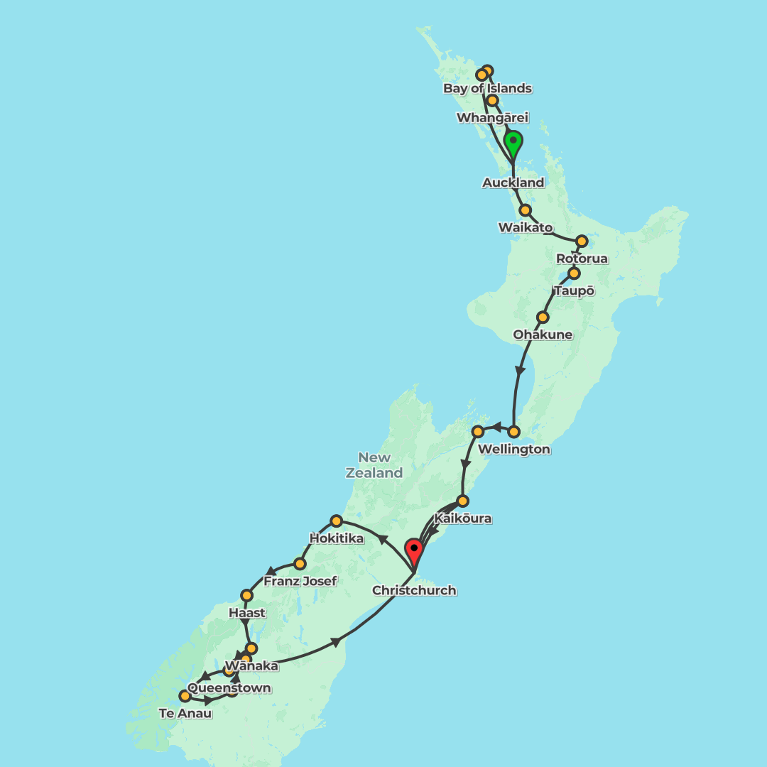 A 21-day southbound New Zealand journey from Auckland to Christchurch, blending coach travel, ferry crossings, cultural encounters, wildlife experiences and epic scenery from the Bay of Islands to Fio