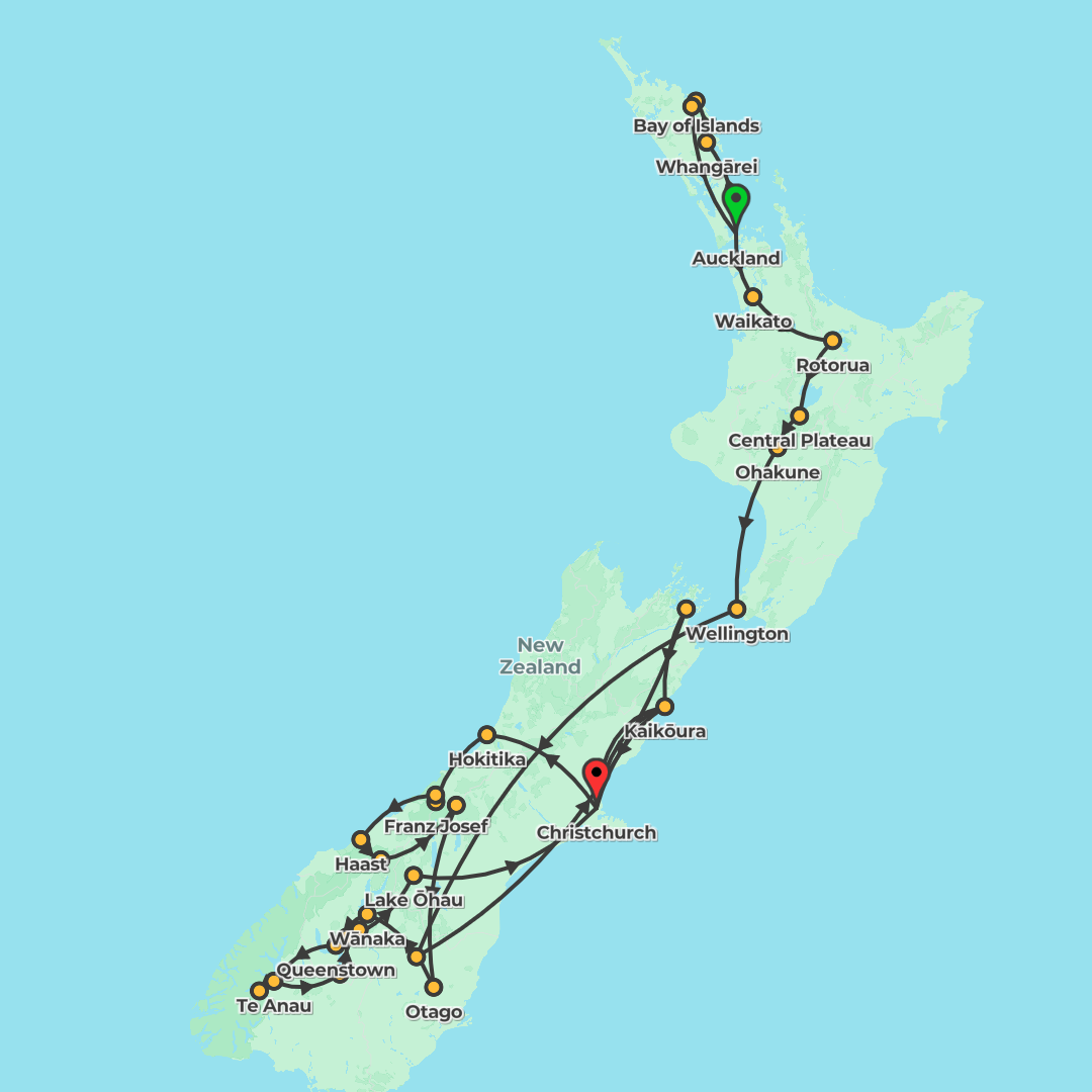 A 21-day southbound adventure from Auckland to Christchurch, blending lively cities, dramatic coastlines and alpine scenery with memorable cultural experiences and cruises.