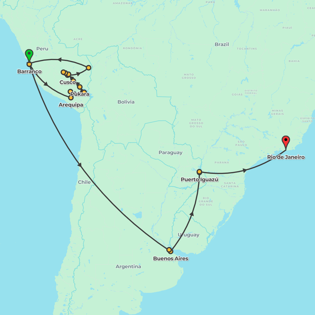 An epic journey from Lima to Rio across six countries, blending jungle, high Andes, salt flats, world-famous waterfalls and island time, with guided experiences and flexibility to reach Machu Picchu b