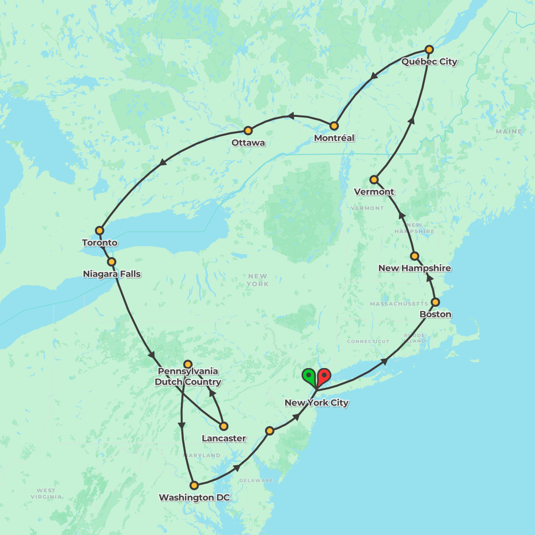 Discover the best of Eastern Canada and the USA on a 14-day guided journey from Toronto to Washington, D.C., taking in Niagara Falls, Montreal, Quebec City, Boston and New York City with memorable loc