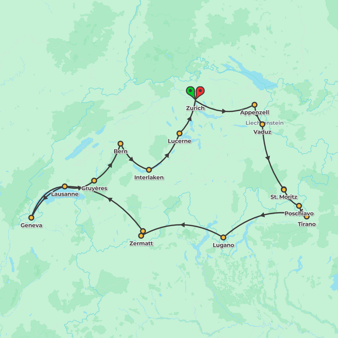 Circle Switzerland on a 10-day journey from Zurich featuring St. Moritz, Lugano, Zermatt, Lausanne and Lucerne, with the Bernina Express and time to explore at leisure.
