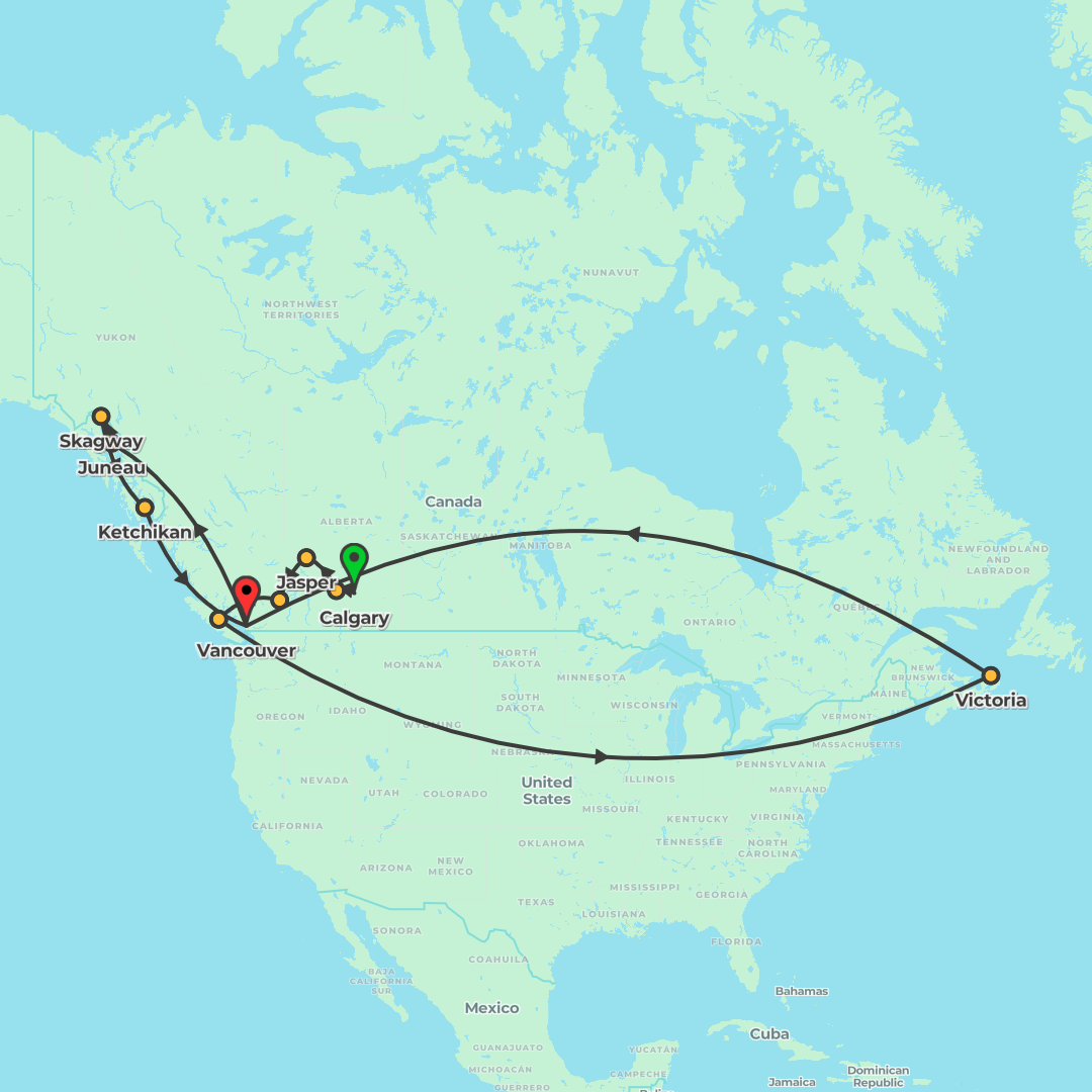 From Vancouver, trace a scenic loop to Victoria, Whistler, Jasper, Lake Louise, Banff and the Okanagan, blending guided highlights with ample free time and Choice Experiences across the Canadian Rocki