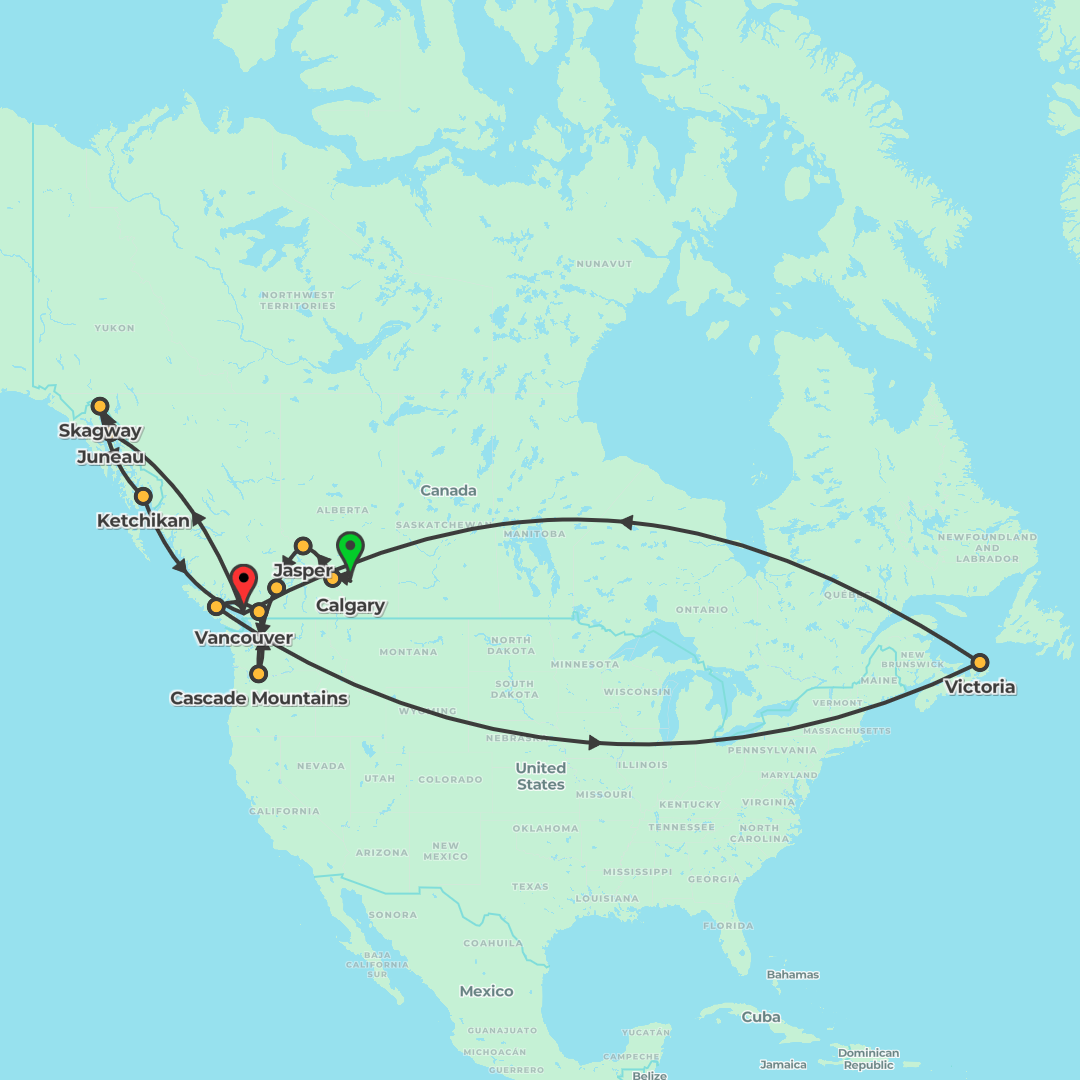 From Vancouver, trace a scenic loop to Victoria, Whistler, Jasper, Lake Louise, Banff and the Okanagan, blending guided highlights with ample free time and Choice Experiences across the Canadian Rocki