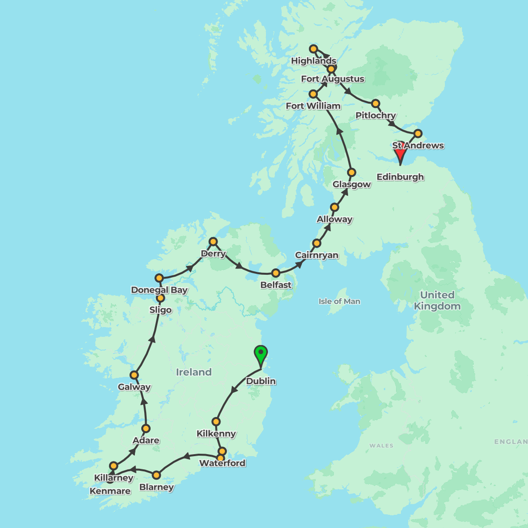 Discover Ireland, Northern Ireland and Scotland from Dublin to Edinburgh, featuring Belfast’s Titanic history, scenic highland drives, castles, a distillery visit and a ferry crossing.