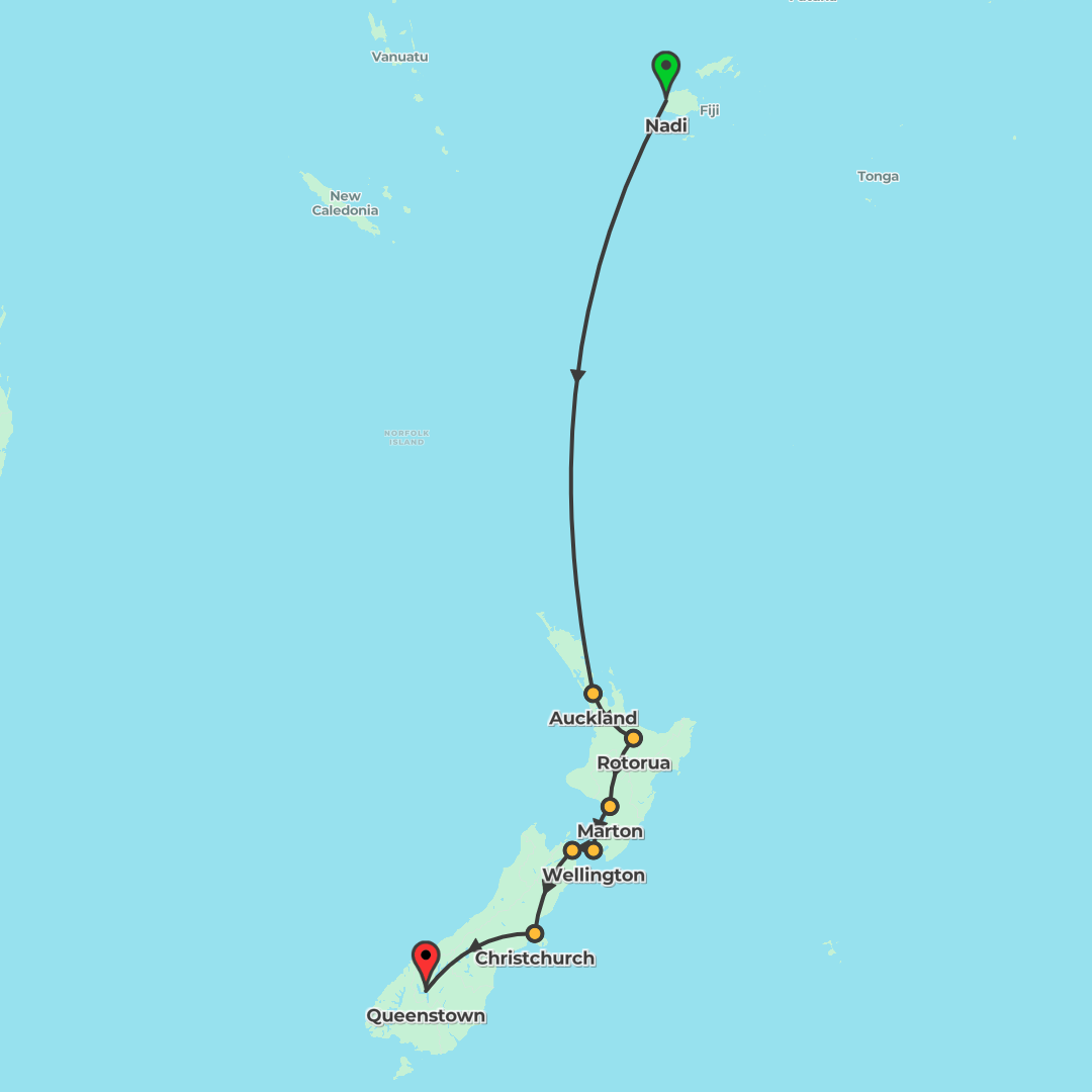 Pair three nights in Fiji with a guided New Zealand journey from Auckland to Queenstown, taking in Rotorua's geothermal sights, Wellington's highlights, a Cook Strait ferry crossing, and a Milford Sou