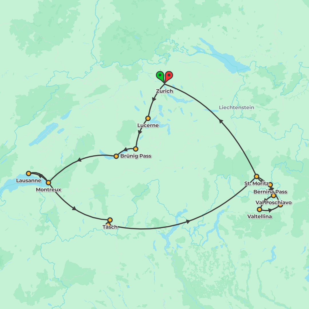 Discover Switzerland by train from Zurich to Lucerne, Montreux, Zermatt, and St. Moritz, with a Bernina Express excursion to Tirano and unforgettable alpine views.