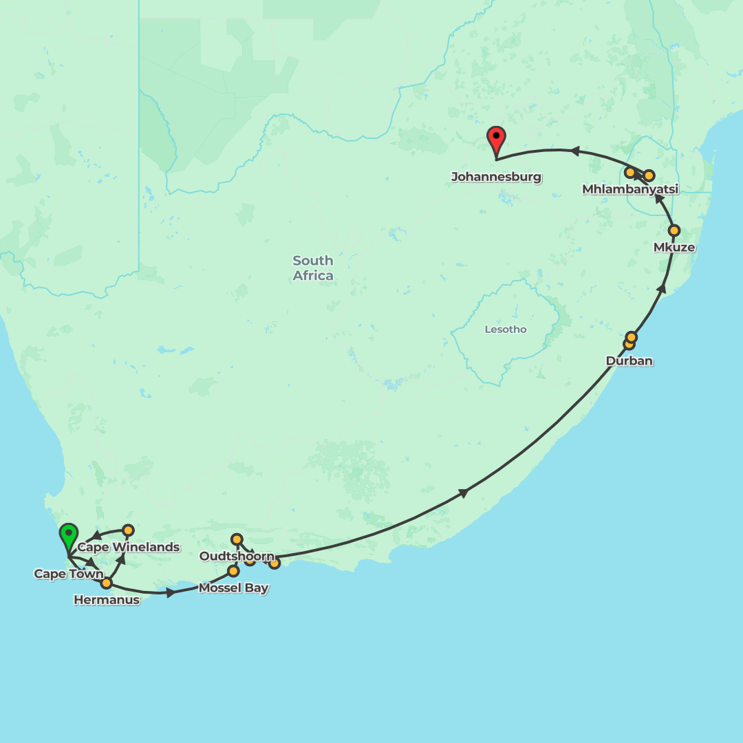 An epic overland journey from Johannesburg to Cape Town, blending camping and hotel stays with game drives, hikes and coastal time across South Africa, Swaziland and Lesotho.