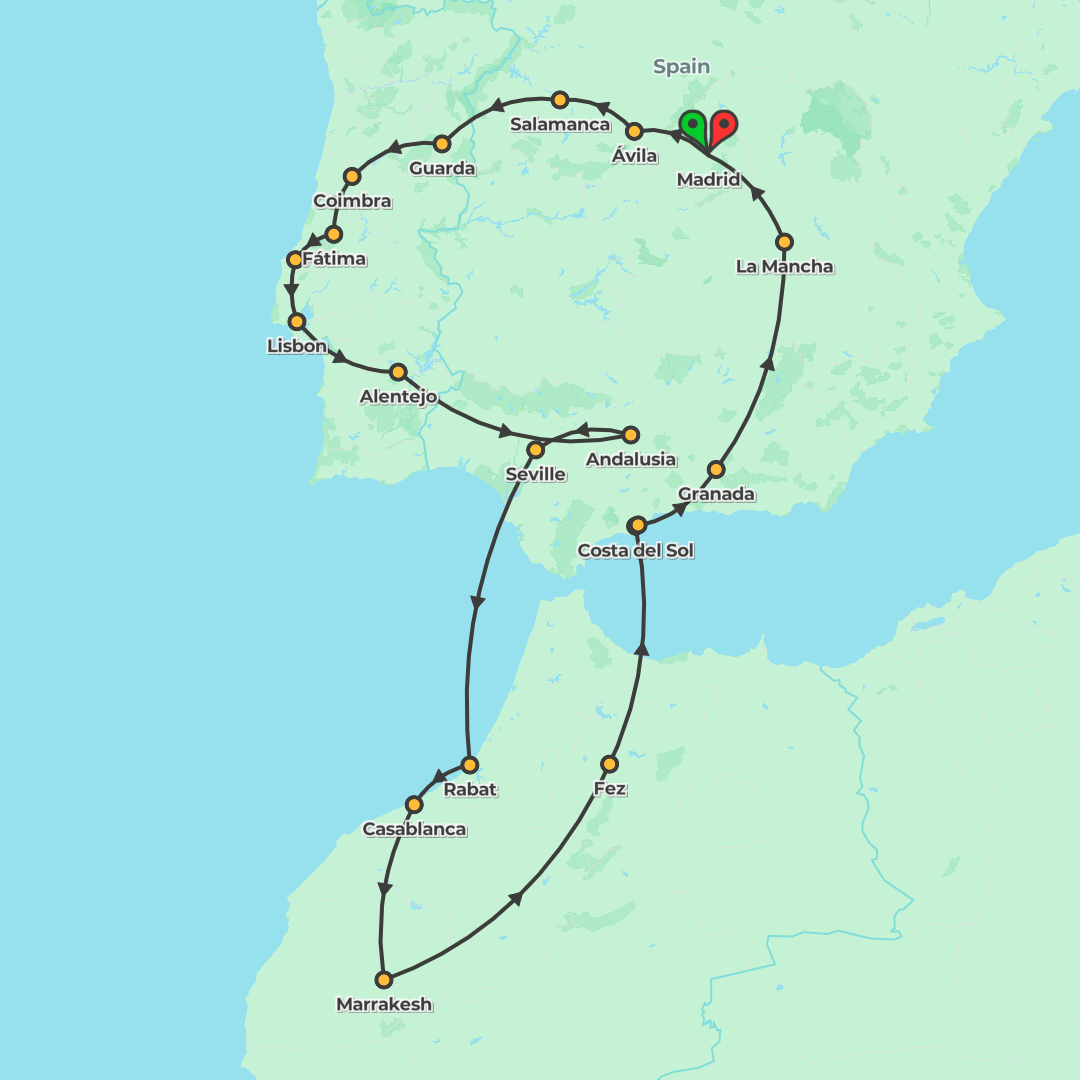 Explore the vibrant cultures of Spain, Portugal, and Morocco on this 32-day adventure, featuring iconic cities, stunning landscapes, and rich history.