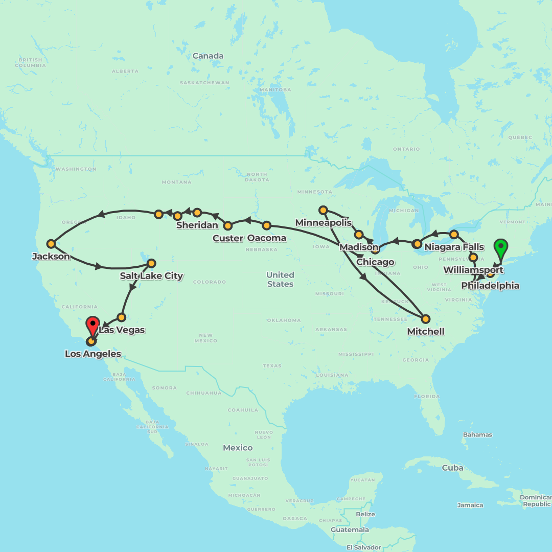 A 23-day coach road trip from Miami to Los Angeles, taking in Orlando, Nashville, Memphis, New Orleans, Houston, Dallas/Fort Worth, Amarillo, Albuquerque and Denver, plus Utah’s national parks, the Gr