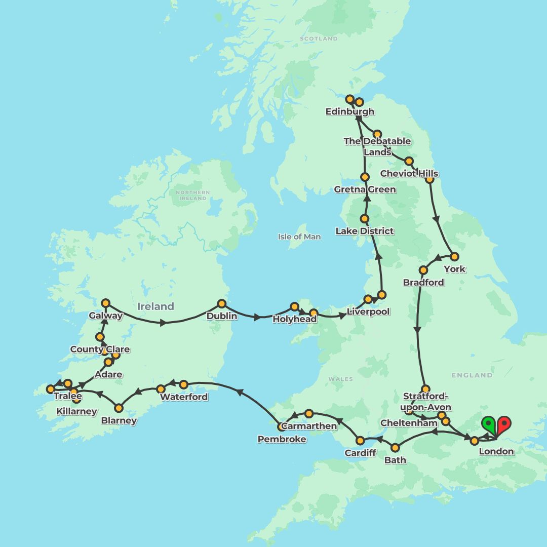 Discover Britain and Ireland on a guided coach journey from London through England, Scotland and the Highlands to Dublin, Donegal, Galway and Cardiff, with city orientations, Local Guides, ferry cross
