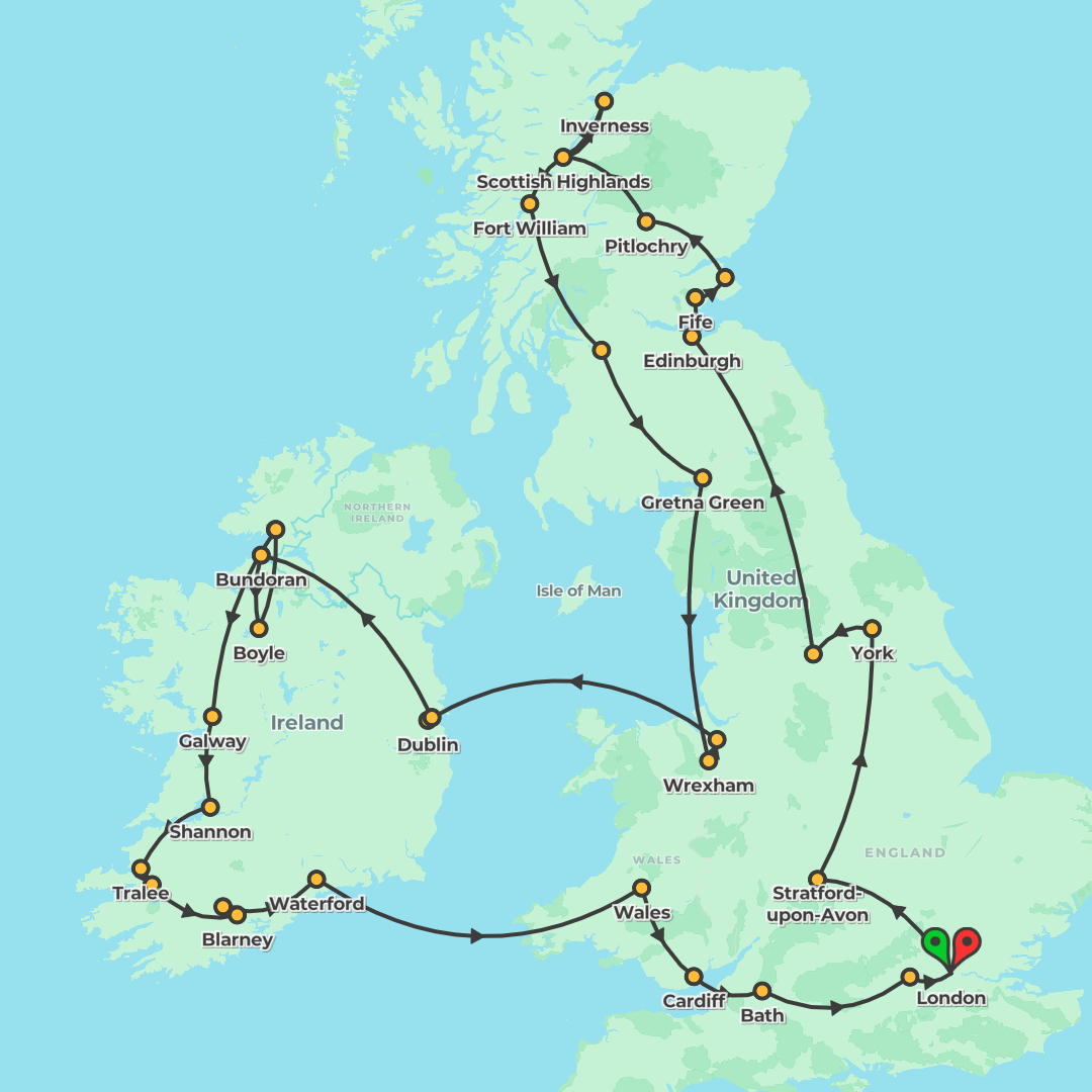 An 18‑day coach adventure from London through England, Scotland, Northern Ireland and Ireland, featuring city highlights, a high‑speed ferry crossing and a Loch Ness cruise, with free time and optiona