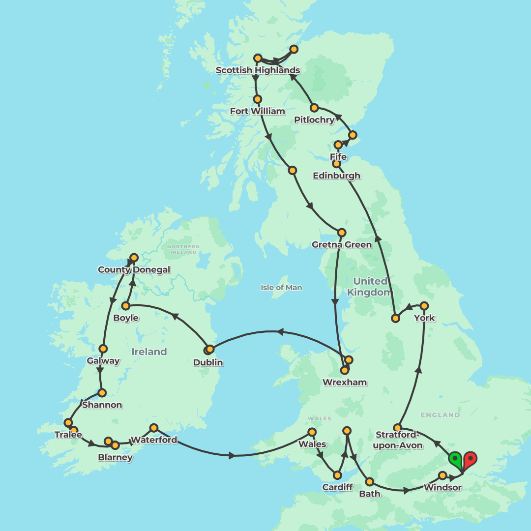 Discover Britain and Ireland on a guided coach journey from London through England, Scotland and the Highlands to Dublin, Donegal, Galway and Cardiff, with city orientations, Local Guides, ferry cross