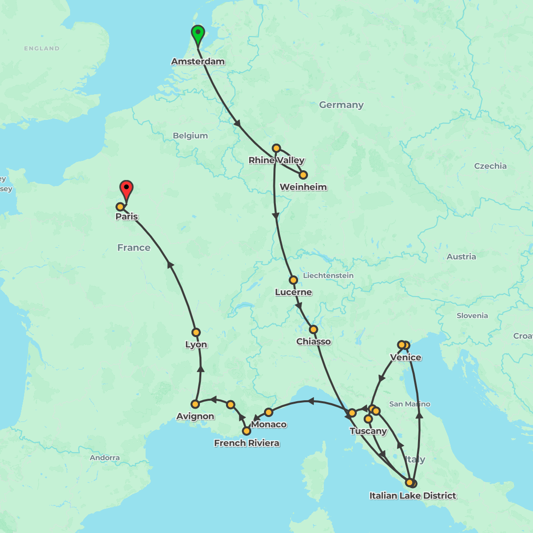 Journey from Amsterdam to Paris via the Rhineland, Lucerne, Innsbruck, Venice, Rome, Florence, Pisa, the French Riviera, and Lyon, with canal and river cruises, guided city sightseeing, scenic drives,