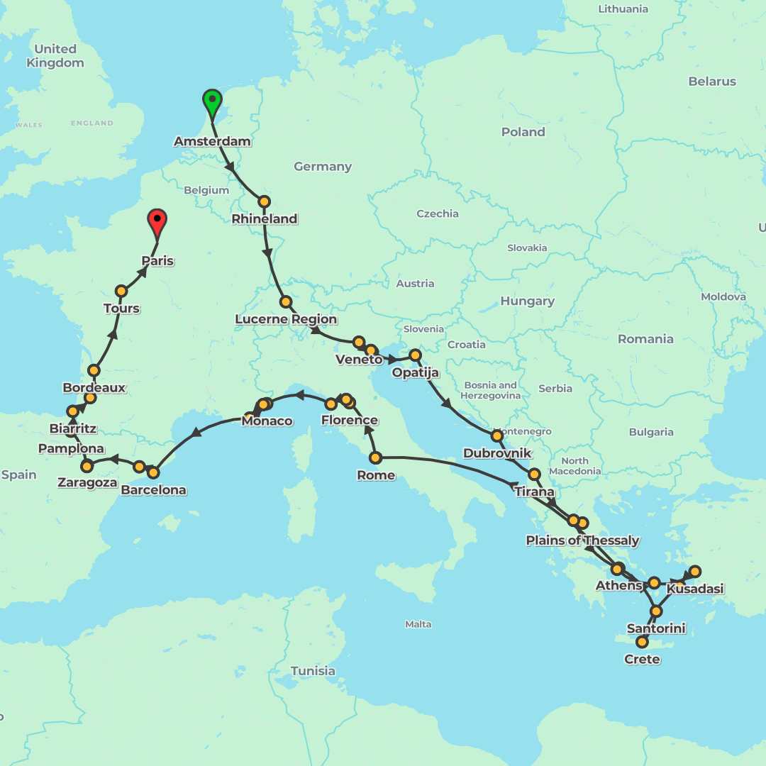 A grand European journey from Amsterdam to Paris visiting 12 countries, highlighted by iconic cities, scenic drives, a Rhine cruise, and a three-day Aegean cruise to the Greek Isles.